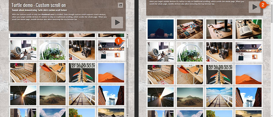 Turtle skin's basic layout features a fixed header area utilizing the theme image as background. With this feature on only the thumbnail area below is scrolled. This ensures the header is always visible while browsing through the album. This feature has some drawbacks too. When the theme image is too high, there's not much space left for the thumbnails. This affects small resolution screens and mobile devices in landscape mode the most. So, if you are targeting mobile devices, it's better to turn off this custom scroller and use the normal full page scroll.