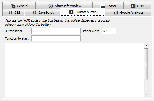 - Add HTML content in this box, which appears on a popup window, when the visitor clicks the custom button. Check out the sample album above to get the idea!