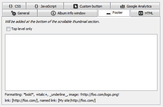 You can place simple text (with formatting) or HTML code here too. Make sure to turn off Preformatting in the latter case.