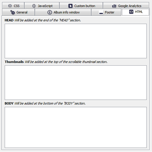 </head>tag. Useful for adding external Javascript or CSS files. Or a<script>...</script>block. - Thumbnails