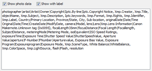 photographer|artist|Artist|Owner|Copyright|Iptc.By-line|Iptc.Copyright Notice, Xmp.Creator, Xmp.Title, objectName, Xmp.Subject, Xmp.Description, keywords|Iptc.keywords, Xmp.Format, Xmp.Rights, Xmp.Identifier, Xmp.Label, Country/Primary Location, Province/State, City, Sub-location, originalDate|Date/Time Original|Date/Time|CreateDate|ModifyDate, camera|Model, lens|Lens|Xmp.Lens-Information|Canon Makernote.Unknown tag (0x0095), focalLength35mm|focusDistance|Focal Length|Focallength, SubjectDistance, meteringMode|Metering Mode, isoEquivalent|ISO Speed Ratings, exposureTime|Exposure Time|Shutter Speed Value|ShutterSpeedValue, Aperture Value|aperture|F-Number|FNumber|Aperturevalue, Exposure Bias Value, Exposure Program|Exposureprogram|Exposure Mode, Xmp.SceneType, White Balance|WhiteBalance, Xmp.ColorSpace, Xmp.LightSource, flash|Flash, resolution