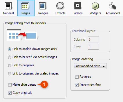 - Make slide pages = ON: jAlbum will generate a separate HTML page for all the images in the album – I will call this
